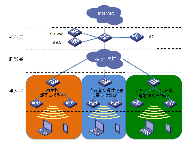 酒店室内空间多样,室外环境各有特色:既有客房这类低用户密度、高带宽需求的场景,又有会议中心、餐厅等高用户密度、相对低带宽需求的场景,还有商务中心这类对带宽要求很高的场所,此外也有花园、露台等带宽要求低但是覆盖面积广的室外场所。在进行WLAN部署的时候需要综合考虑酒店对前厅、客房、餐厅、娱乐、会议与室外等各类场所的无线网络接入需求,同时无线酒店解决方案需要满足网络认证计费、业务推广、安全监管和运营维护等方面的需求。